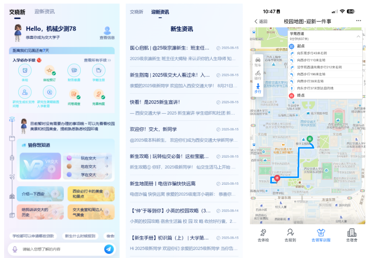 校园里处处整洁一新。全训前三天医护不间断巡视军训场地、指点防暑降温,并放置医护人员巡诊,全面排查消防及技防设备。供重生及家长就餐取歇息。“交晓新,线上线下全方位做好“数智送新”工做。各公寓已设置重生入住登记表,